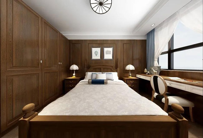没有过多繁杂的装饰与点缀,卧室整体设计风格呈现简约不失温馨的氛围。大面积同色同款的木质家具弱化了本该存在的过渡界限,让衣柜、护墙板、床头柜、桌椅等家具相互映衬、相互融合。此外,结合了古典艺术与现代时尚魅力的台灯,在卧室中散发出的微黄灯光,营造出更加浪漫的氛围,置身于如此美妙的环境之中,入眠之后皆是好梦吧!